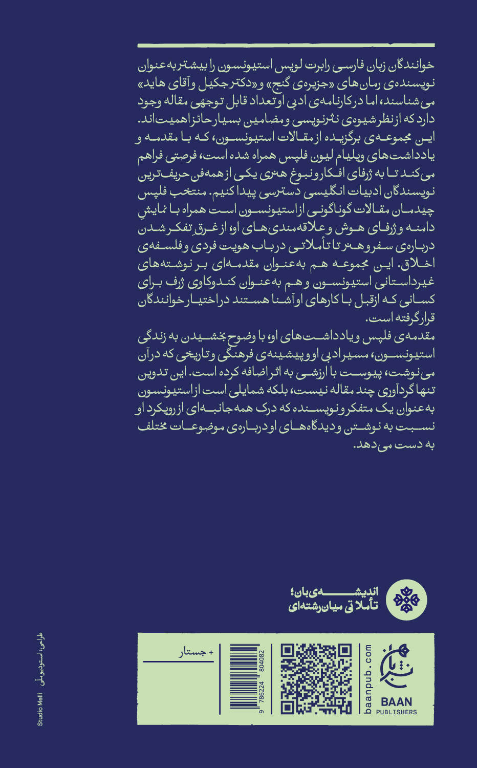 خوانندگان زبان فارسی رابرت لویی استیونسون را بیشتر بهعنوان نویسندهی رمانهای جزیرهی گنج و دکتر جکیل و آقای هاید میشناسند، اما در کارنامهی ادبی او تعداد قابل توجهی مقاله وجود دارد که از نظر شیوهی نثرنویسی و مضامین بسیار حائز اهمیتاند. این مجموعهی برگزیده از مقالات استیونسون، که با مقدمه و یادداشتهای ویلیام لیون فلپس همراه شده است، فرصتی فراهم میکند تا به ژرفای افکار و نبوغ هنری یکی از همهفنحریفترین نویسندگان ادبیات انگلیسی دسترسی پیدا کنیم.